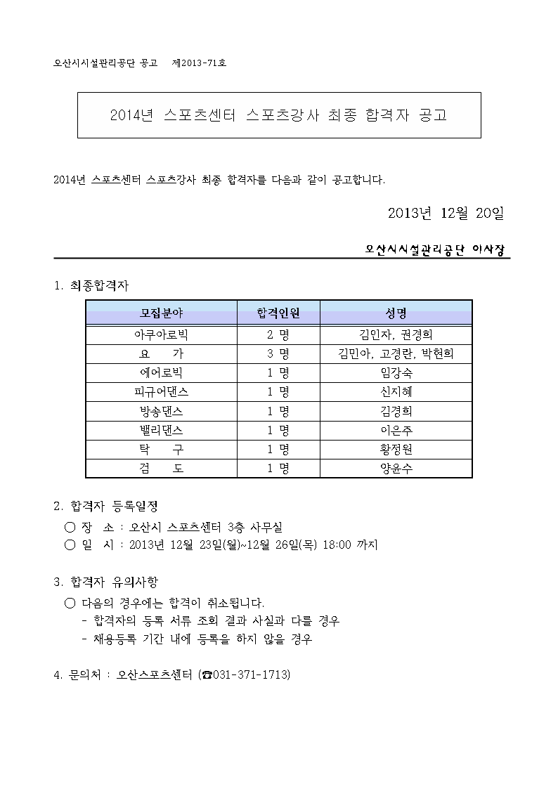 2014년 스포츠센터 스포츠강사 최종합격자 공고