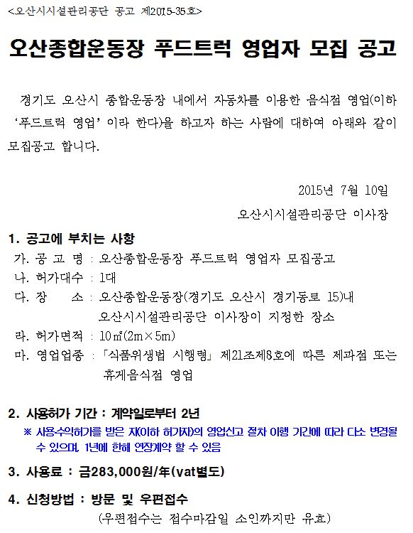오산종합운동장 푸드트럭 영업자 모집공고입니다.