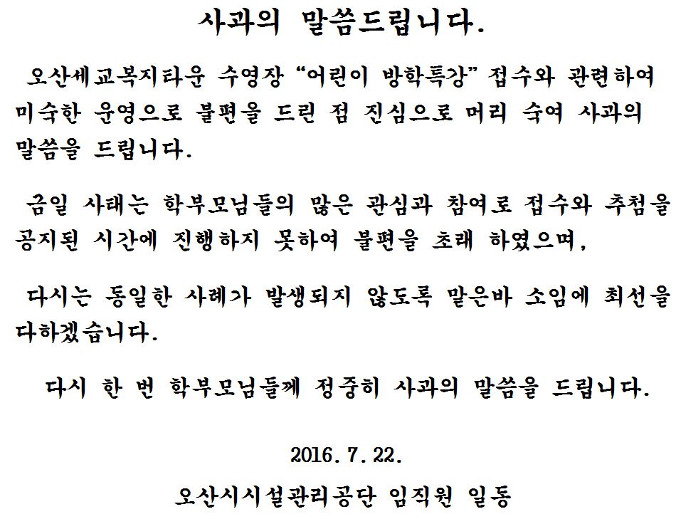 오산세교복지타운 수영장 어린이 방학특강 공개 추첨 안내